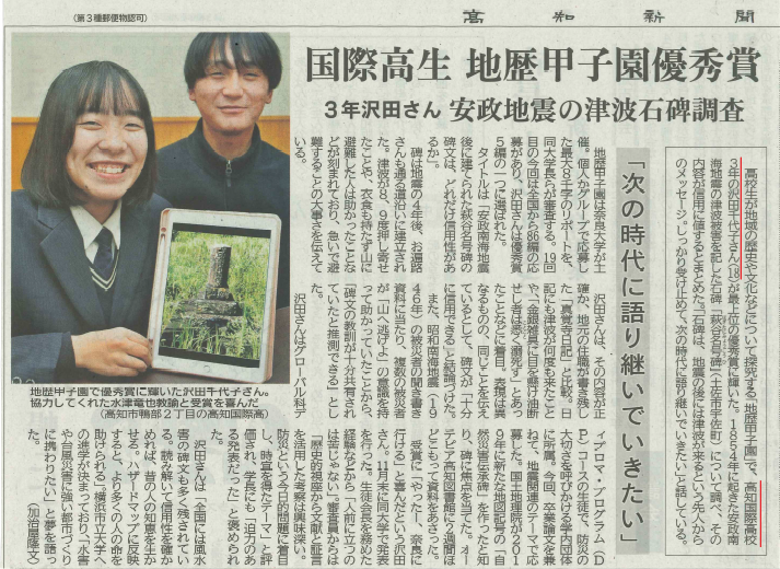 卒業生の頑張っている姿が高知新聞に掲載されました